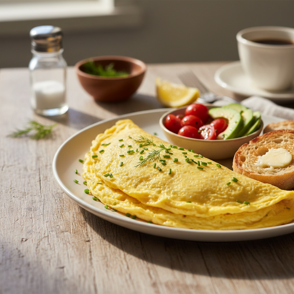 Vienas populiariausių derinių – omletas su avokado ir pomidorų salotomis, pašlakstytomis citrinos sultimis ir alyvuogių aliejumi. Rūgštelė puikiai subalansuoja kiaušinių ir sviesto riebumą. Taip pat puikiai tinka lengvai apkeptos smidrų viršūnėlės arba tiesiog riekė geros, skrudintos raugo duonos su plonu sviesto sluoksniu. Jei norite prabangos pojūčio, ant karšto omleto uždėkite gabalėlį sūdytos lašišos ir pabarstykite šviežiais krapais. Svarbiausia taisyklė pateikiant – lėkštė turi būti bent šiek tiek pašildyta, kad omletas neatvėstų vos ją palietęs, taip išlaikant jo purumą iki pat paskutinio kąsnio.